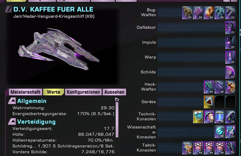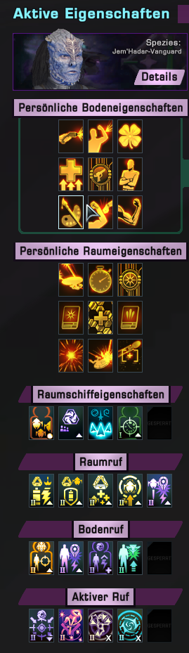 Hier mal ein paar Screenshots von meinem Build. Da ich noch keine DOFF für den aktiven Raumdienst eingeteilt habe, ... ist das natürlich auch nicht dabei.