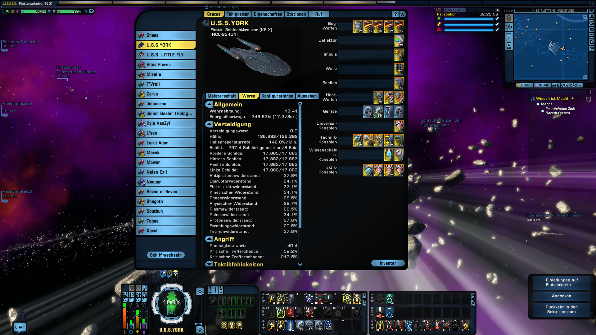 Die Skillung ist ein normale Skillung für einen Taktiker. Die Ausrüsung ist zum größten Teil eine Mischung aus Ruf, Flotte und Missionen. Bei den Phaser ist es egal ob man F&E Phaser oder welche von der Tauschbörse nimmt. Die Konsolen "Bioneurale Infusionskreisläufe" und "Tachyokinetischer Umwandler" stammen aus dem Lobistore. Die Konsole "Bevorstehende Qual" gibts an der Tauschbörse. Da ich ja die Flotten K6-X Variante fliege habe ich noch einen Universal Platz frei. Da habe ich die D.O.M.I.N.O Konsole vom Bajor Eventschiff drin. Alternativ kann man dort auch einen weiteren Schwachstellen Lokalisierer, den Schwarmprozessor (Lobi) oder aber den M6 Computer (K3 Perseus Klasse) einsetzen.