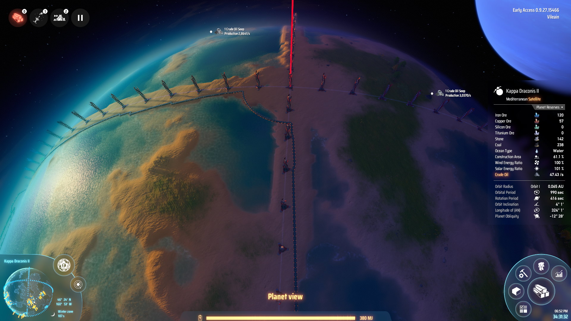 In meinem Fall hier hab ich sogar mehrfaches Glück gehabt. Die beiden anderen Planeten haben genau die Rotation (oder auch nicht), damit immer die gleiche Seite der Sonne zugewandt ist. Somit kann ich auf der dunklen Seite meine Produktionsstätten aufbauen, während auf der Sonnenseite entweder Sonnenenergie "geerntet" wird oder mit Railguns kontinuierlich Solarsegel zur Sonne geschossen werden können.