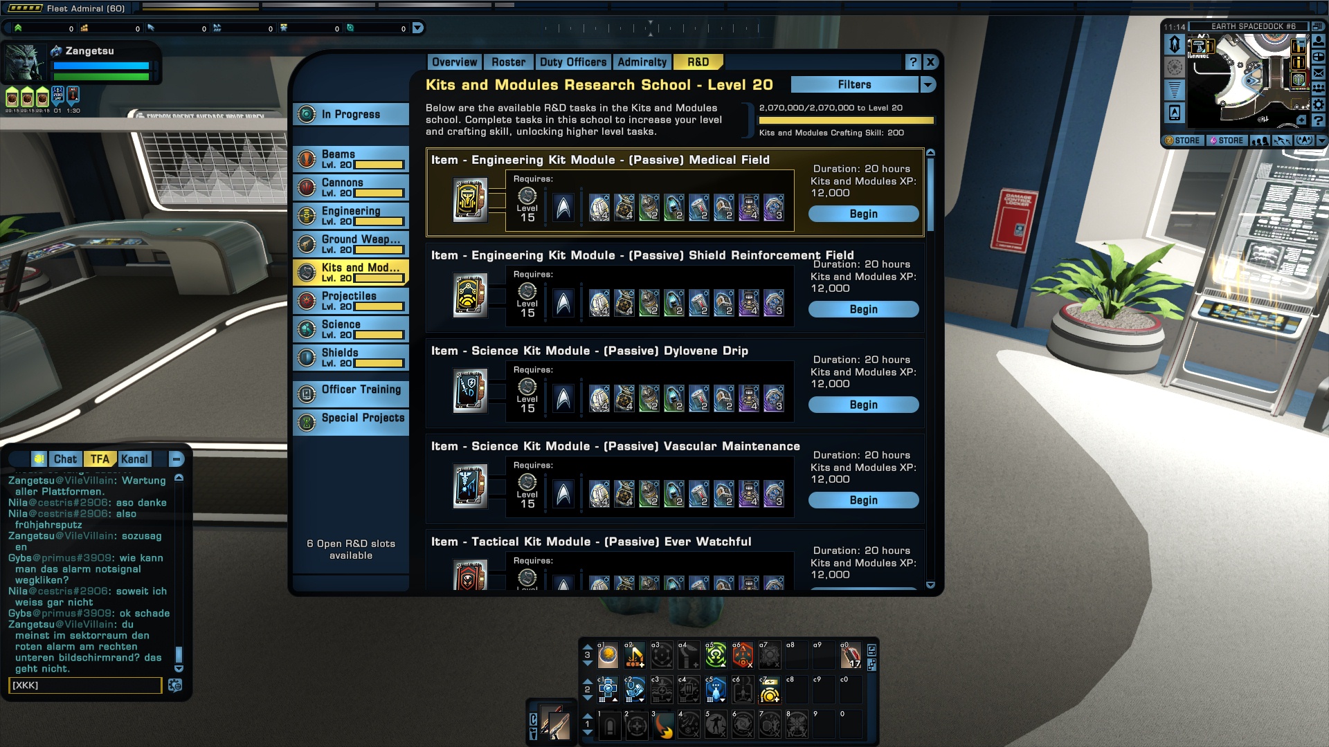 Um überhaupt in Item craften zu können, braucht man einen Doff, der die Fähigkeit für F&E bzw. R&D hat (das steht in seiner Beschreibung). Solche Doffs kann man an der Börse zu horrenden Preisen (ver)kaufen. In F&E Paketen (ZEN Store) tauchen ab und an auch Doffs mit Crafting Fähigkeit auf (welche das ist, ist zufallsgeneriert, genauso wie der Doff und seine Qualität). Je seltener der Doff, desto höher die Chance ein besseres Item zu bekommen.