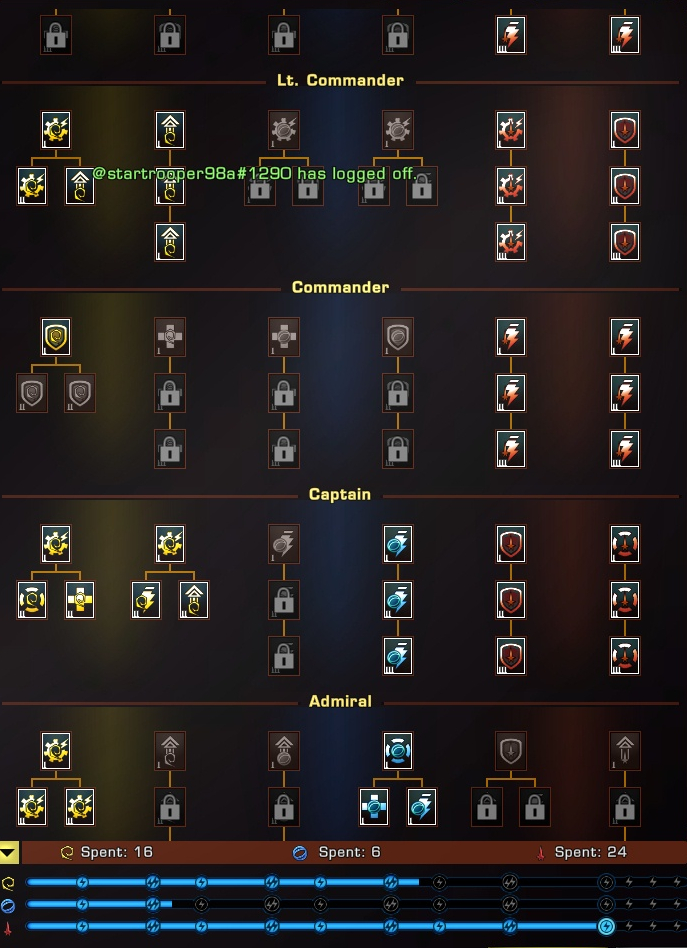 - EPS Overload (EPS Transfer gibt einen Buff, je nach dem, welches Subsystem am meisten Energie hat (falls Waffen +CritH; falls Hilfsenergie +CritD, falls Antrieb +PEN, falls Schilde -Waffenenergie))