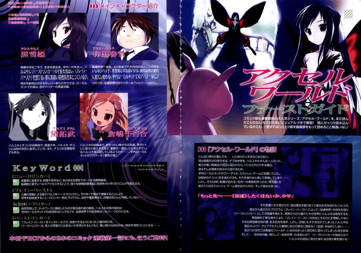 Für Haruyuki ist das reale Leben ein Horror. Mit seiner kleinen und stämmigen Figur ist er nicht gerade ein Frauenheld sondern ein beliebtes Opfer für die Schikanen der Schulraudis. Zuflucht findet er in der virtuellen Welt, wo er seiner Leidenschaft, dem Squash nachgehen kann. Nur Kuroyukihime hat es geschafft ihn darin zu schlagen. Das hübsche und beliebte Mädchen macht Haruyuki ein ganz besonderes Angebot, ein Computerprogramm namens Brain Burst, das es ihm ermöglicht im realen Leben die Zeit praktisch anzuhalten. Doch diese Fähigkeit ist nicht umsonst, alle Benutzer müssen regelmäßig gegeneinander antreten und gewinnen sonst sperrt sich das Programm für sie für immer.